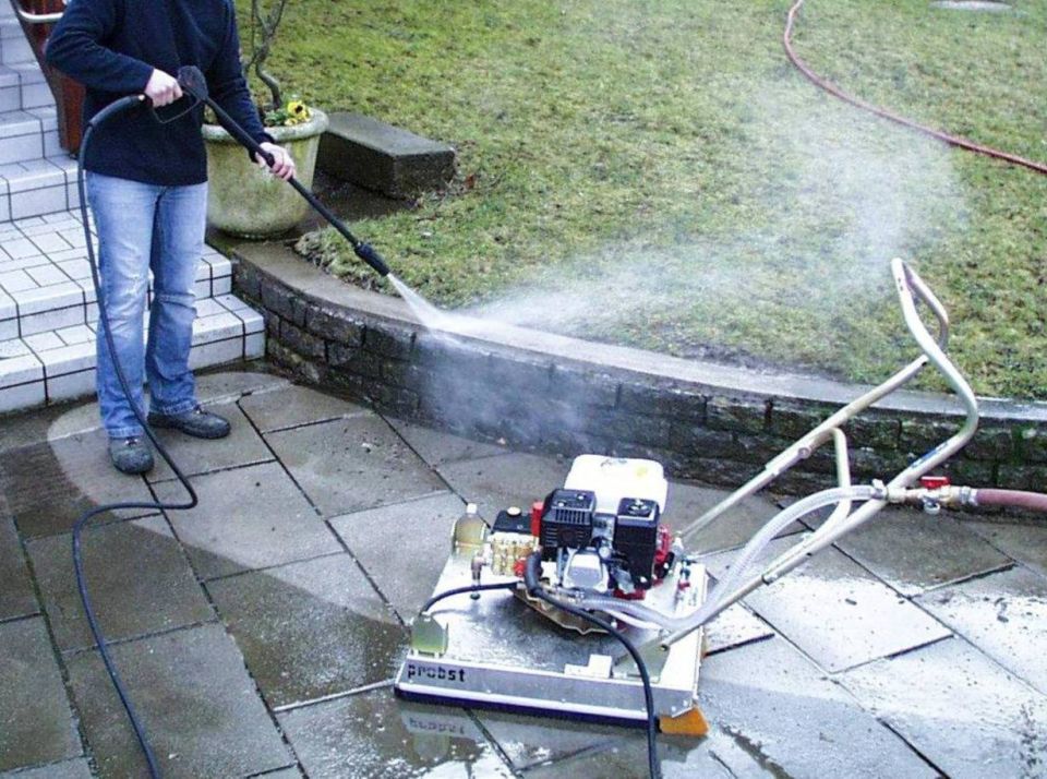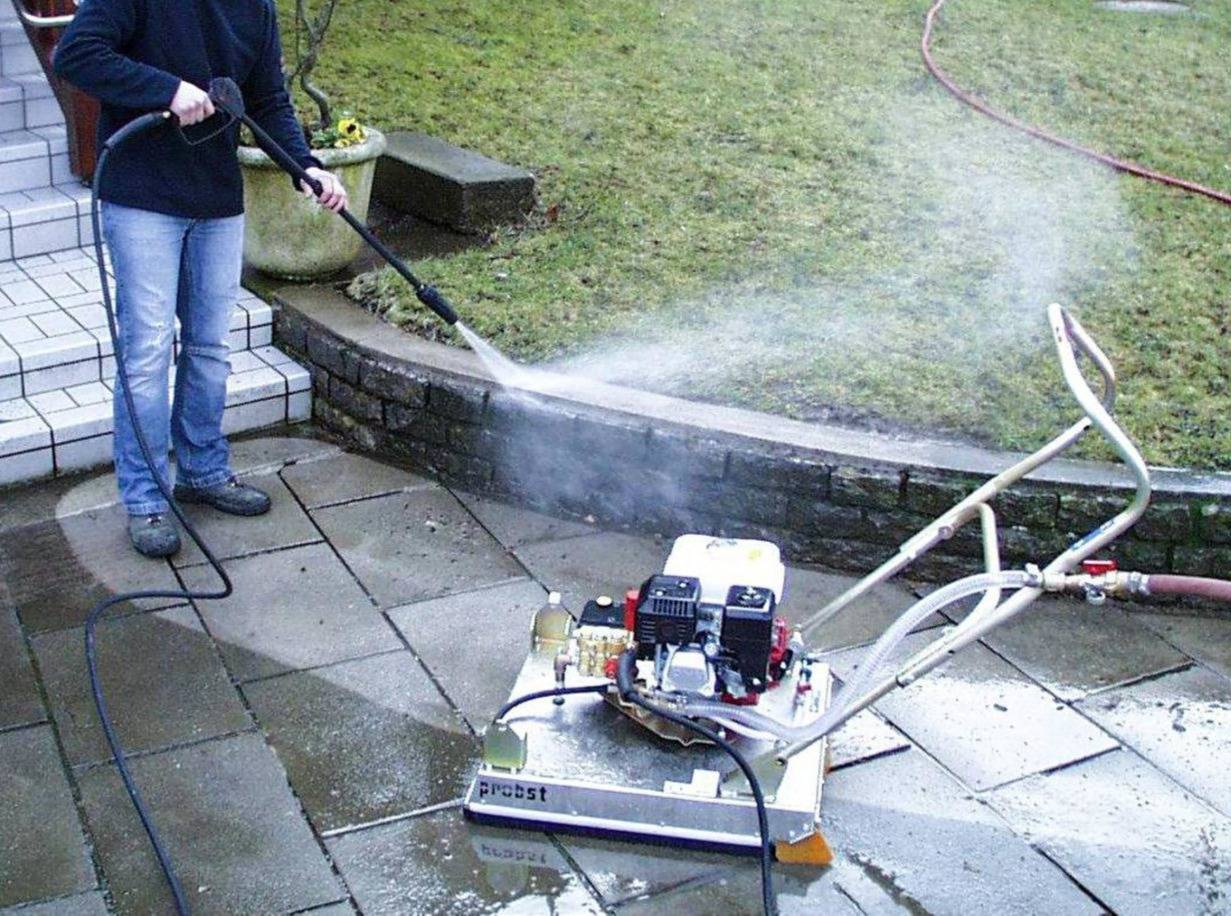 Der Probst EC 60 ist ein benzinbetriebener, vom Stromnetz unabhängiger Hochdruck-Flächenreiniger zur schnellen und gleichmäßigen Reinigung von Betonpflaster, Platten- und Natursteinbelägen. Unter einer geschlossenen Spritzschutzhaube arbeiten rotierende Hochdruckdüsen, die Oberflächen und Fugen porentief reinigen, ohne dabei die Umgebung zu verschmutzen. Dadurch eignet sich das Gerät besonders für effiziente, saubere Einsätze im Garten- und Landschaftsbau sowie im kommunalen Bereich.