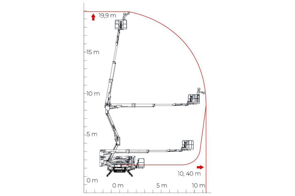 - Kompaktheit und Höhe: Bietet 20 m Arbeitshöhe bei extrem geringen Transportabmessungen (schmale Durchfahrtsbreite und niedrige Transporthöhe).