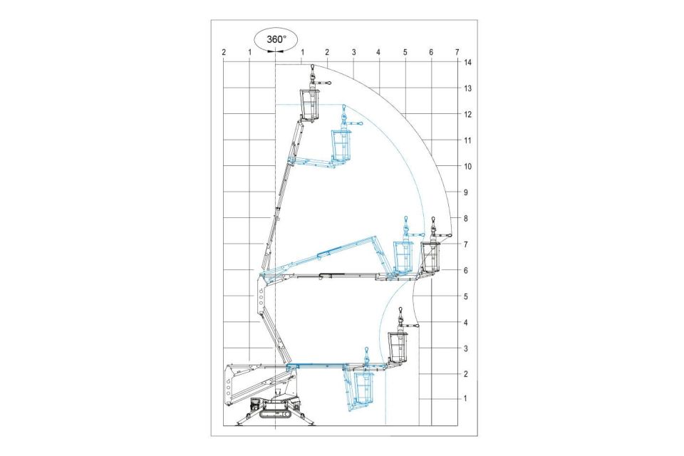 - Hohe Flexibilität: Sie bietet eine maximale Arbeitshöhe von ca. 13,90 m bis 14,00 mund eine seitliche Reichweite von bis zu ca. 7,00 m (abhängig von der Korblast).
