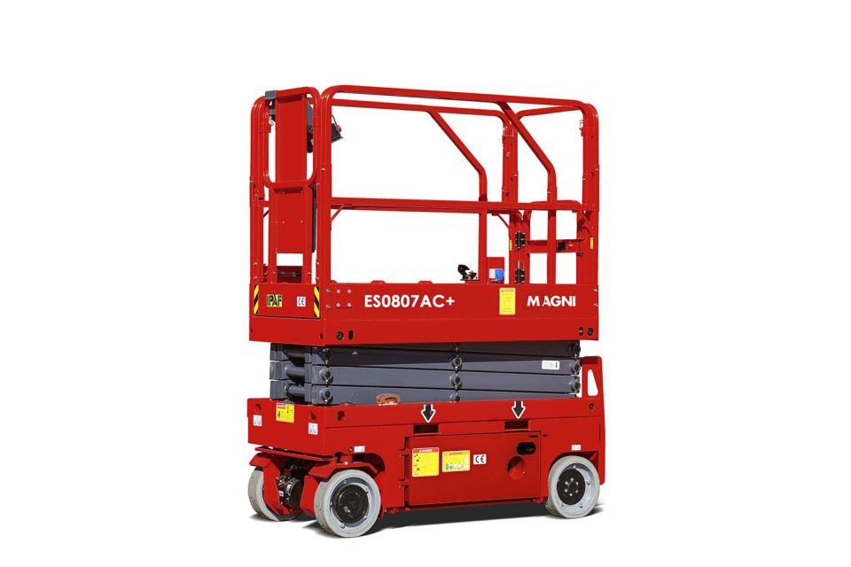 Die Magni ES0807AC ist eine extrem kompakte und leichte Elektro-Scherenbühne und gehört zur Klasse der Mini-Scherenbühnen. Sie zeichnet sich durch ihre besonders geringe Breite und Höhe aus, was sie zur idealen Wahl für Arbeiten in sehr engen Innenräumen macht.